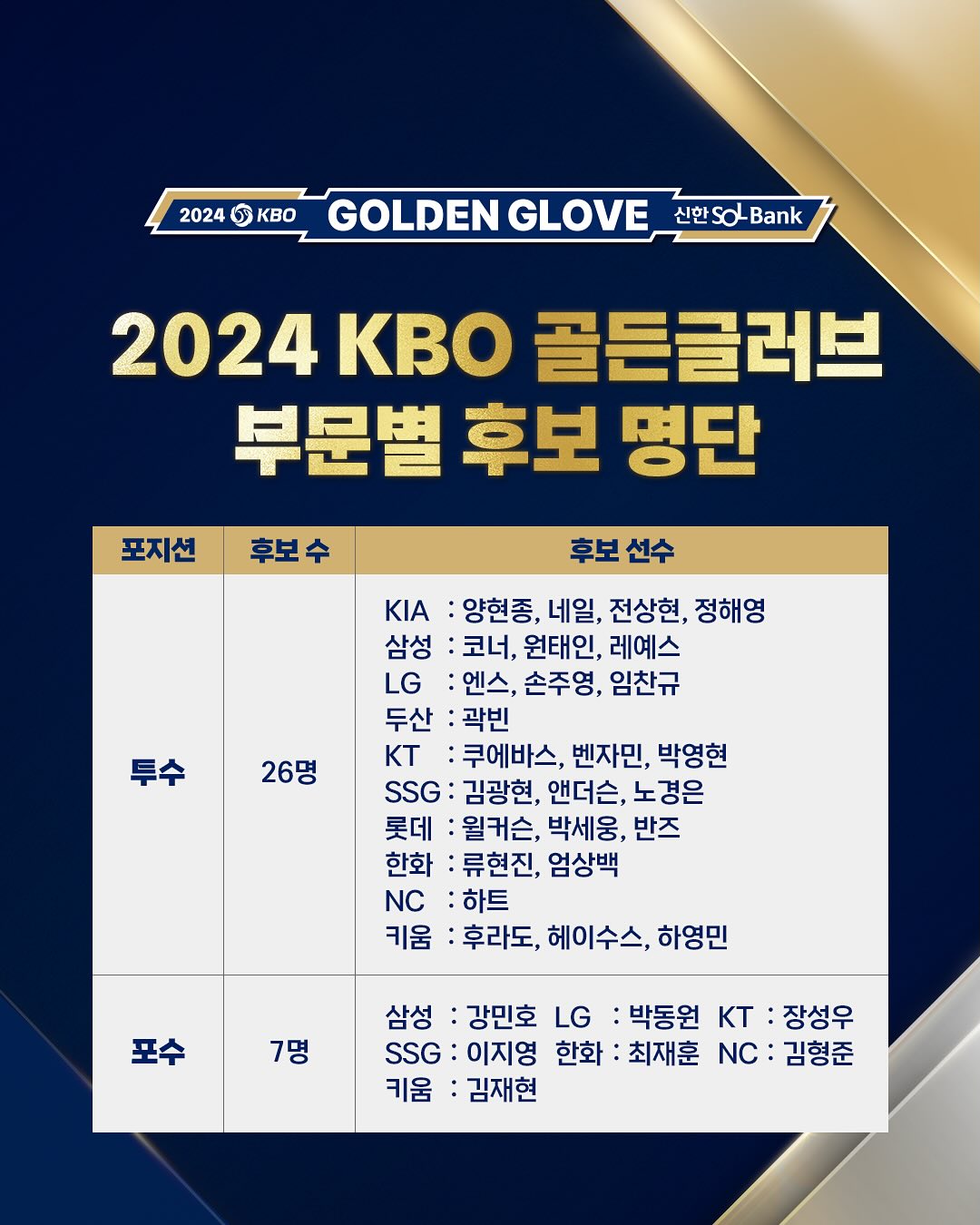 마지막으로 투표권이 주어진다면 포지션별 뽑고 싶은 선수는 투수 부문은 불굴의 '네일', 포수는 선수 경력 첫 한국시리즈에 서 본 '강민호', 1루는 홈런왕과 타점왕의 싸움으로 격전지지만 50홈런에 가까웠던 '데이비슨'을 선택하겠습니다. 2루수는 김선빈을 선택하고 싶지만 MLB포스팅에 도전하는 '김혜성'에게 최후 픽을 선사하고, 3루는 키움의 '송성문'(지못미 김도영 ㅠ ㅠ), 유격수는 그래도 3할 우승팀 유격수인 '박찬호'가 받아야 한다고 생각합니다. 외야는 너무 좋은 선수들이 많은데 그 중에 3명만 고르는 게 너무 어렵지만 다년 계약의 모범 삼성의 '구자욱', 최다 안타 신기록 롯데의 '레이예스', 마지막 한 명은 '에레디아'와 '로하스'도 잘했지만 출루머신 '홍창기'를 뽑지 않을 수 없습니다. 끝으로 지명타자는 나이를 거꾸로 먹는 사나이 '최형우'가 최고령 골든글러버가 되길 바랍니다. 팀별로 정리하면 KIA 3명, 삼성 2명, 키움 2명, LG 1명, 롯데 1명, NC 1명으로 총 10명입니다.(안타깝게도 제 픽에는 두산, KT, SSG, 한화 선수들이 없네요. 내년에는 꼭 배출할 수 있길 응원합니다.)